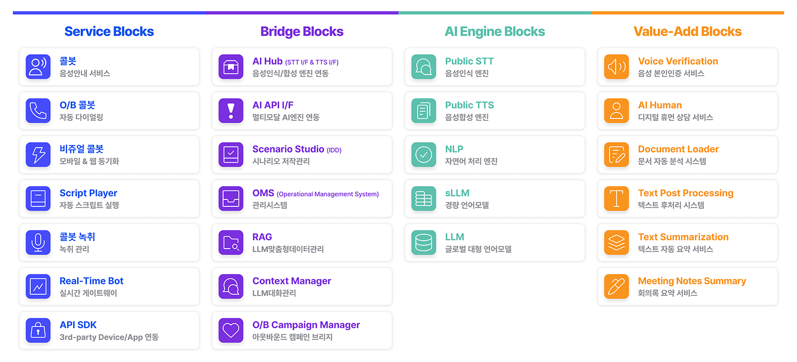 고객 접점부터 차별화된 서비스 제공에 이르기까지, Service Blocks, Bridge Blocks, AI Engine Blocks, Value-Add Block에서 제공하는 여러 Block들을 마치 레고 블럭처럼 자유롭게 선택하고 조합할 수 있도록 설계되었습니다.