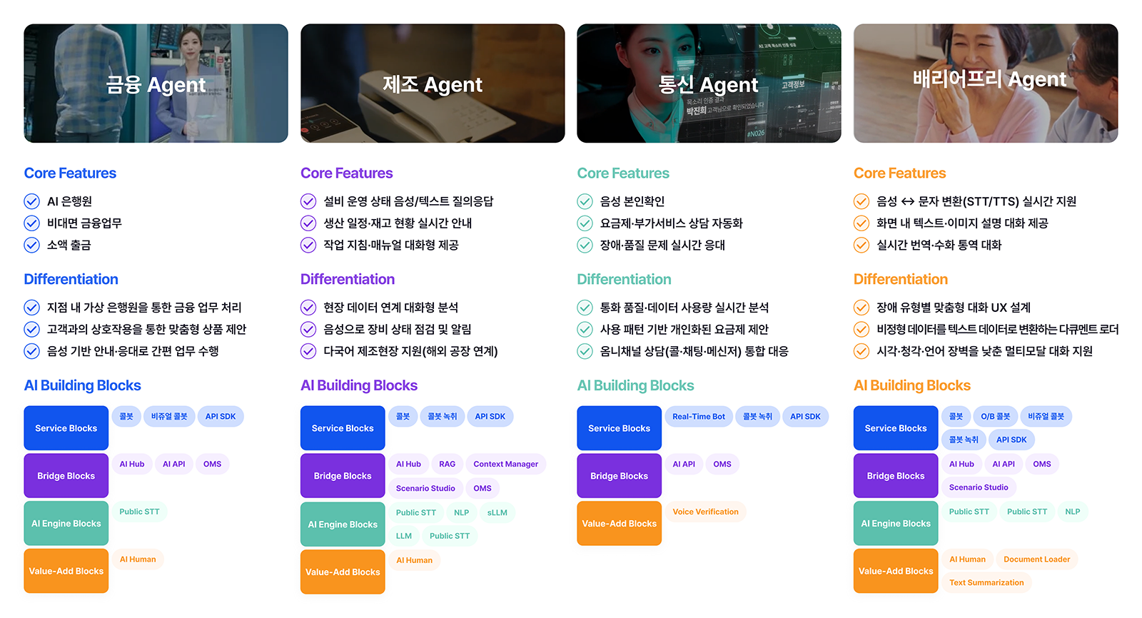 AI Agent가 필요한 분야라면 금융, 통신, 제조, 복지·공공 등 어떤 산업에서도 고객사의 요구에 맞춘 최적의 AI Agent를 설계하고 적용할 수 있는 유연한 서비스를 제공합니다.